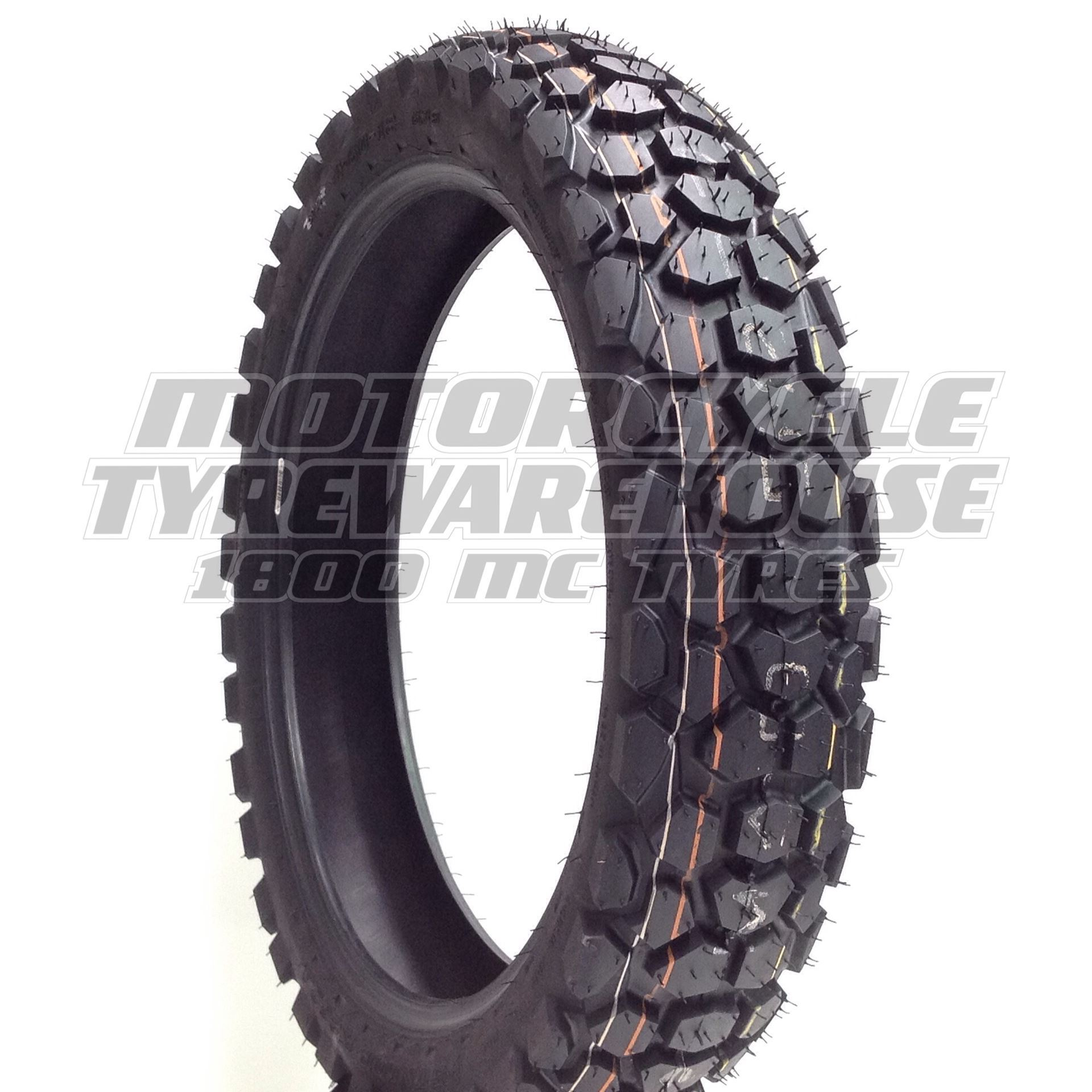 On/off road dual sport tyre, with a road oriented tread pattern suitable for mostly highway use.